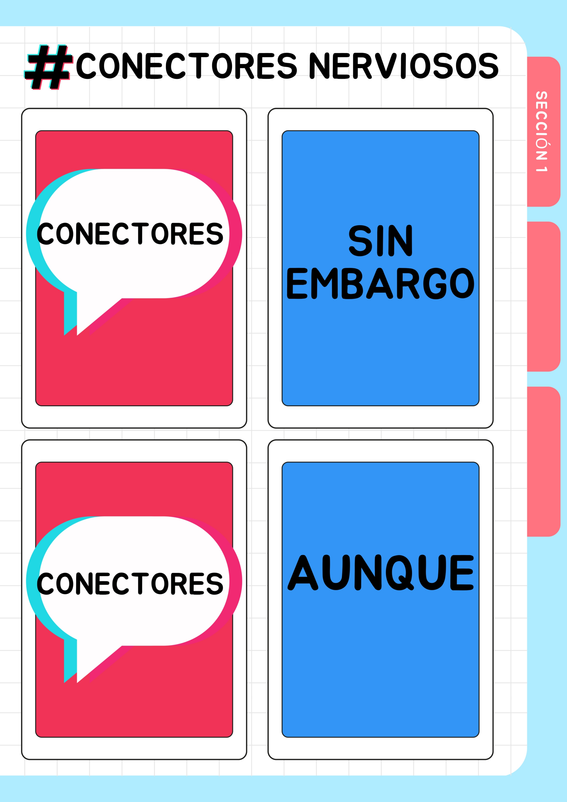 «Conectores Nerviosos» es una experiencia lúdica diseñada para estudiantes de primer año de enseñanza media. En este juego grupal, cada participante debe escuchar y analizar una frase del mazo de cartas y rápidamente identificar el conector adecuado para completar la frase de manera coherente y con sentido. Los jugadores que seleccionen el conector correcto ganan «seguidores», lo que los acerca a la posibilidad de ser invitados a los «TikToks Awards». Para ganar, los participantes deben conocer bien las características de los conectores y usarlos con precisión y rapidez en el juego.